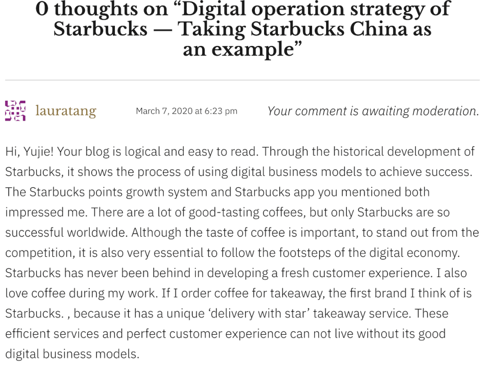 Guo, Y.(2020, March 4). Digital operation strategy of Starbucks – Taking Starbucks China as an example. Retrieved from https://yujieguo.design.blog/2020/03/04/digital-operation-strategy-of-starbucks-taking-starbucks-china-as-an-example/